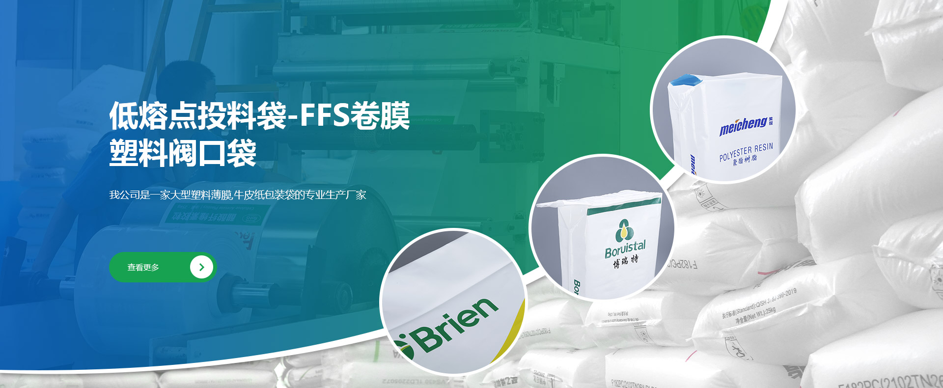 我公司是一家大型集塑料薄膜類、牛皮紙類產品研發、生產和銷售的專業廠家,公司產品大量出口國外。海陽市融昌塑編包裝有限公司創建于1998年,是專業研發、生產和銷售低熔點橡膠投料袋、EVA閥口袋、LDPE多層閥口袋、EVA/LDPE低熔點膜、橡膠包裝膜、FFS重包裝袋、普通塑料包裝袋、牛皮紙閥口袋等產品的綜合包裝類企業。公司坐落于中國.山東省煙臺海陽市,地處黃海之濱,位于青島、煙臺、威海三市的中心地帶,交通發達占地面積35000㎡,固定資產8000萬...